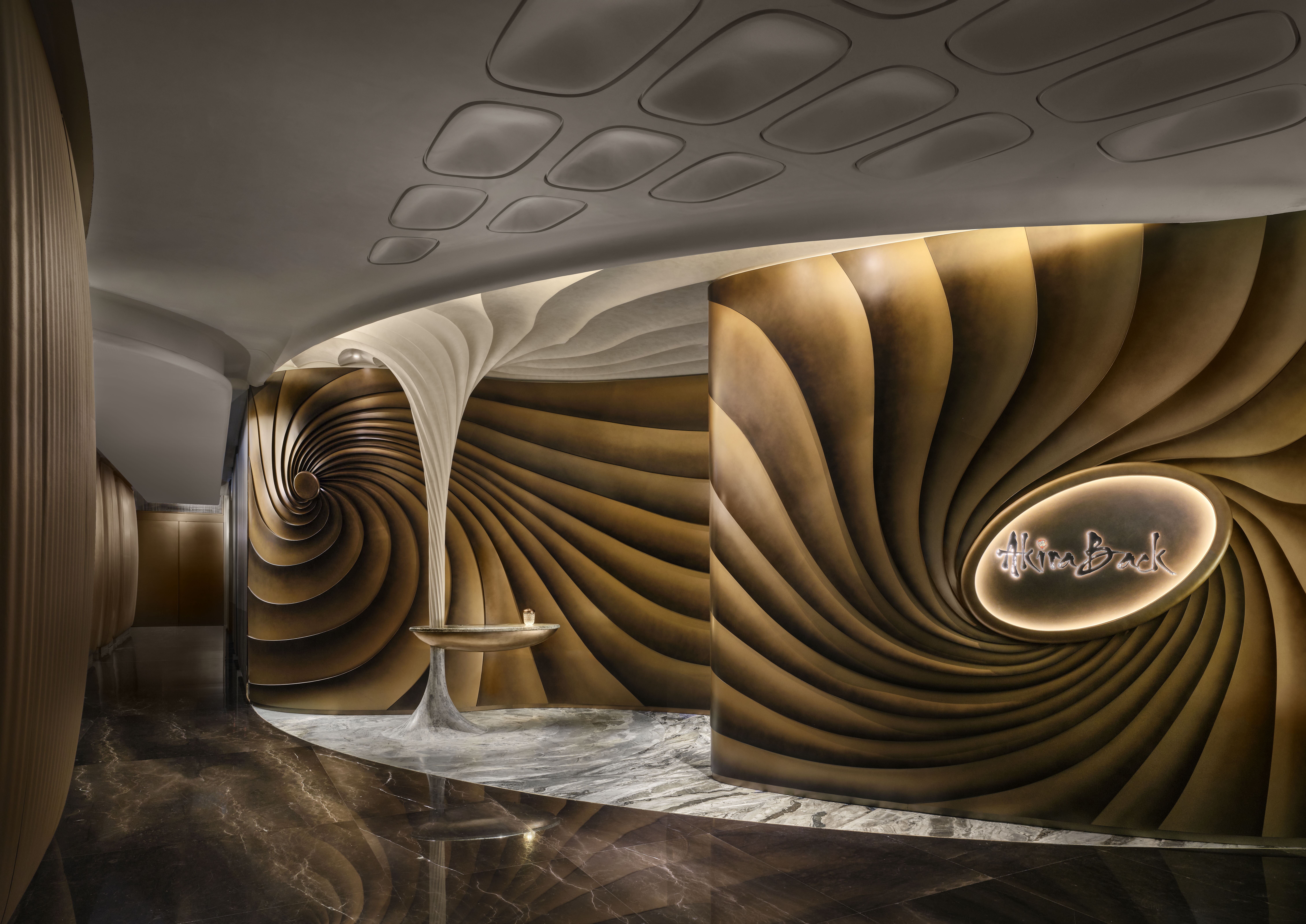 Il percorso inizia con una dichiarazione architettonica imponente: un vortice in metallo forgiato a mano avvolge l’ingresso, collegando soffitto e pavimento in un gesto potente di energia e movimento. Questa soglia scultorea funge sia da simbolo visivo del marchio Akira Back sia da momento di trasformazione, sfumando il confine tra spazio e spettacolo. All’interno, l’atmosfera dinamica prosegue tra modernità vivace e dettagli sofisticati. Colori intensi e motivi decorativi trasmettono energia, mentre tessuti morbidi e lussuosi, pareti in legno intagliato ed elementi dorati aggiungono calore e eleganza.