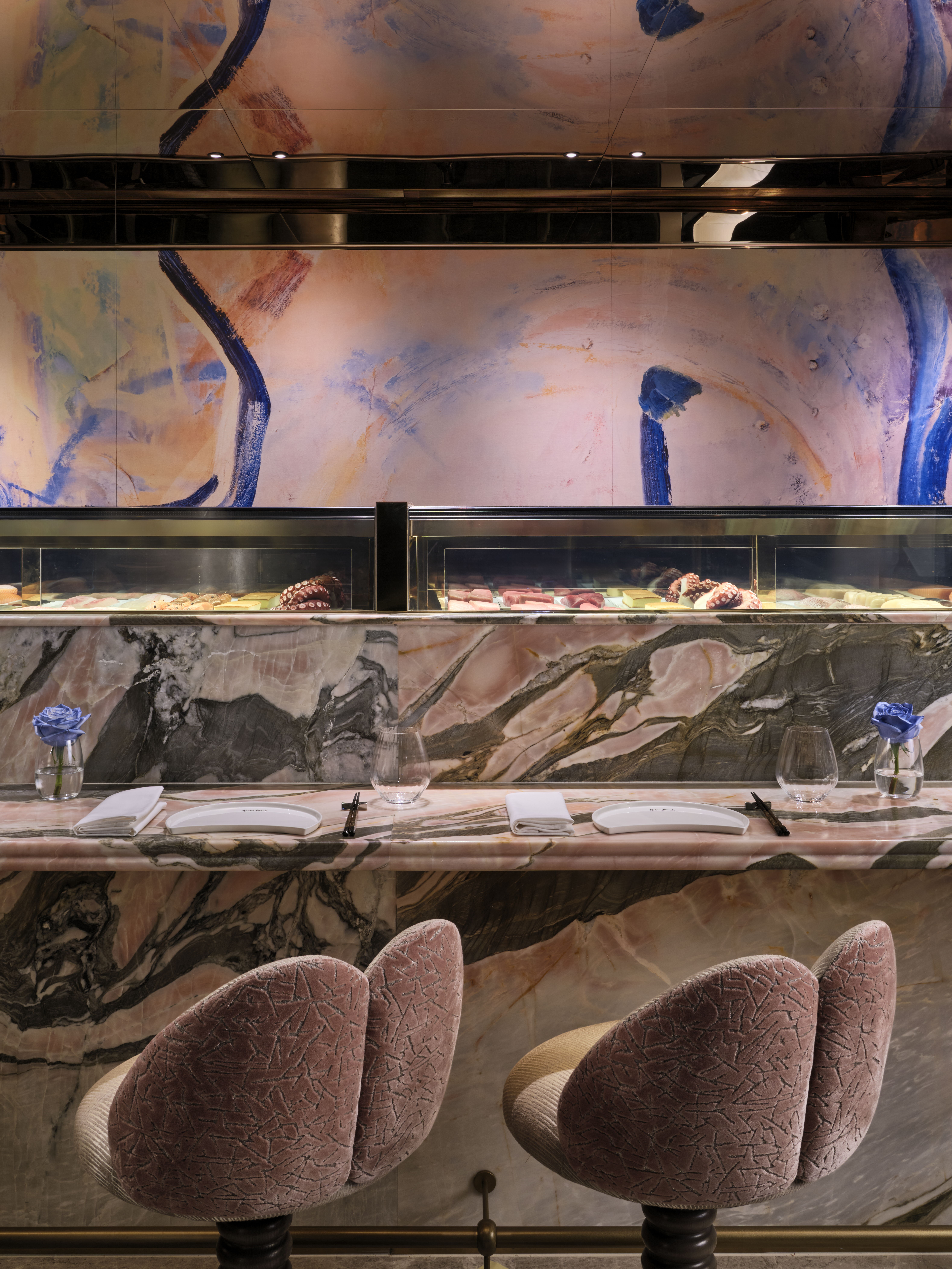 Immediately beyond the entrance, the eye is drawn to the Pink Bar, a show-stopping monolith carved from a rare, single block of pink marble with its bold brushstroke veins accentuating the space’s youthful elegance. More than just a cocktail bar, this exquisite monolith sets the tone for the experience to come, serving as a visual overture to the culinary performance that unfolds throughout the restaurant.