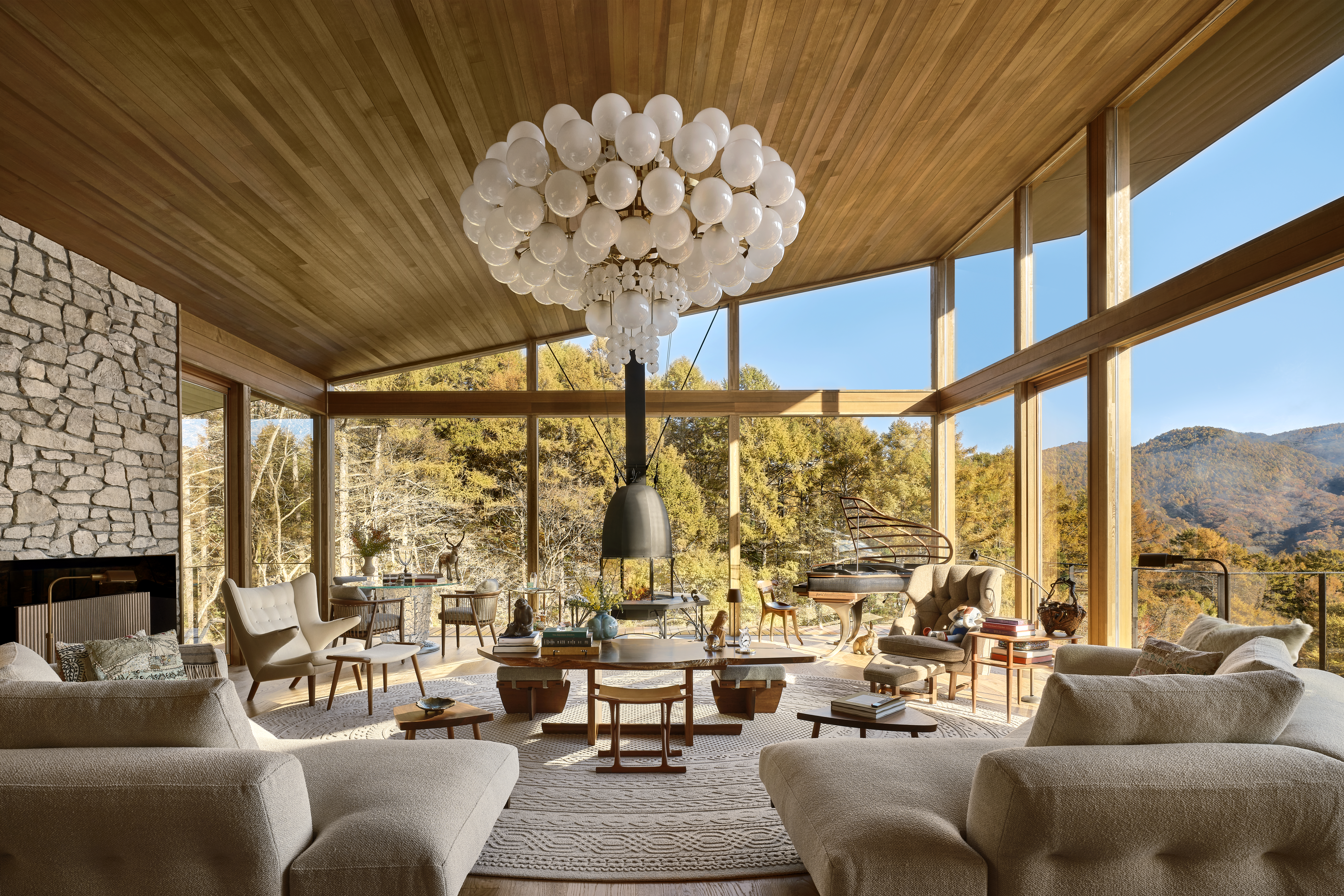 The living room boasts statement features, with floor- to-ceiling windows complemented by a vintage custom chandelier produced by Czech glass manufacturer, Preciosa in the 1970s, and a fireplace commissioned by a local ironsmith. Completing the space are unique pieces such as the Papa Bear Chair by Hans Wegner, the Lounge Chair and Ottoman, model 5761 by Edward Wormley for Dunbar Janus, the Lalique Chene Dining Table, the Viola Chair (designed by AB Concept) by Poltrona Frau, and the Sengu Sofa by Cassina.