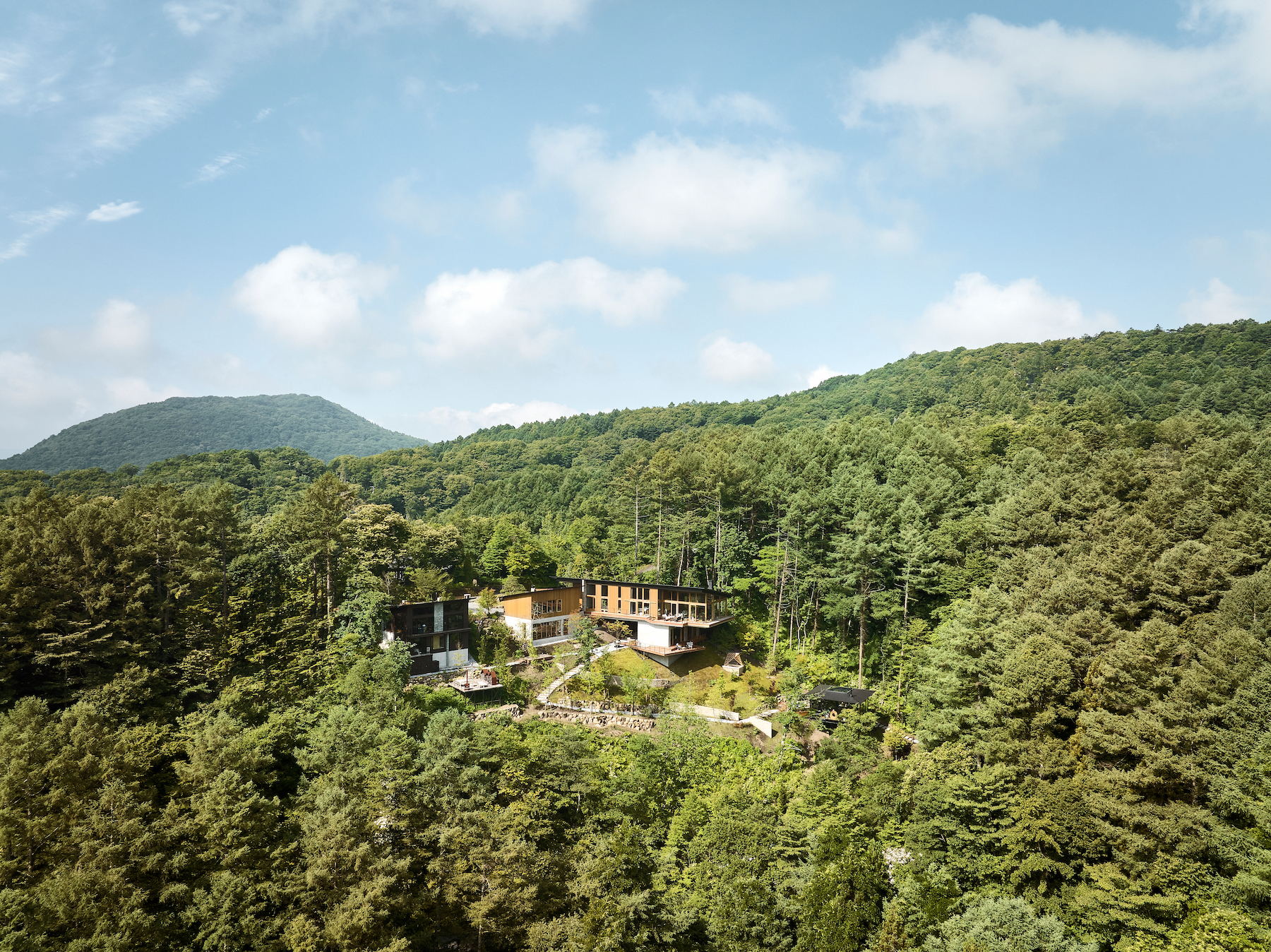 Itsu Sho Sha encompasses four separate buildings over 4,600 sqm, that were developed over two years with a slow, organic approach to design. Built on a slope, the roofline echoes the shape of the mountains to blend into the idyllic surroundings, while the structure is largely formed using Japanese cedar wood to invoke atmosphere, warmth and a woodland scent. Due to high, up to 5m, and low ceilings with expansive window walls, the home offers 360-degree views of Karuizawa as if floating among its elevated plains.